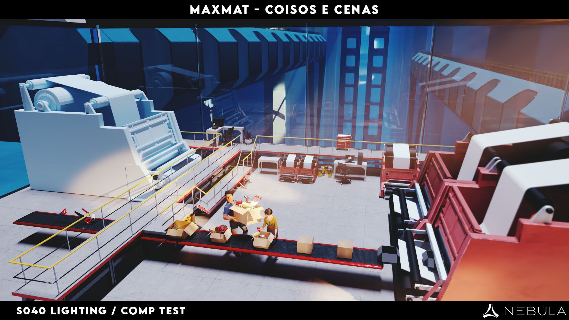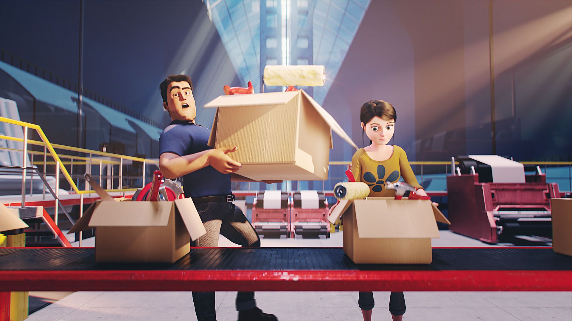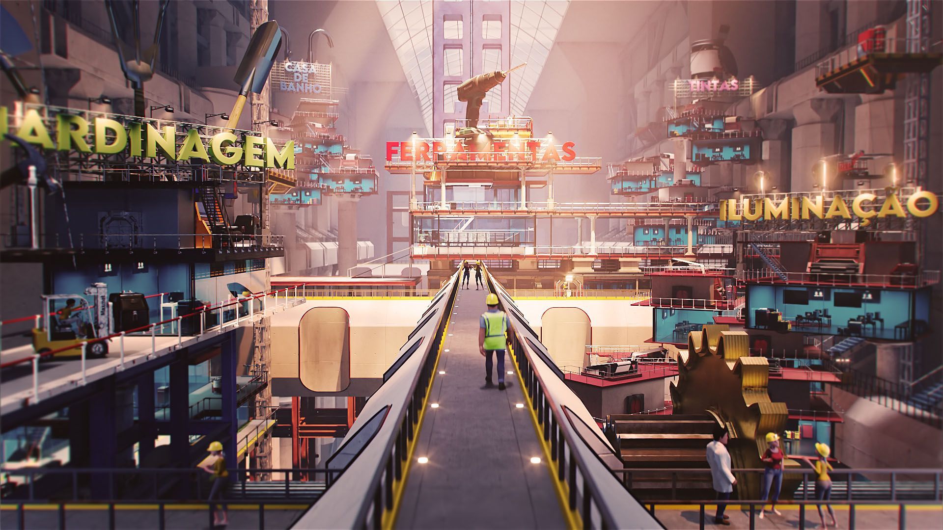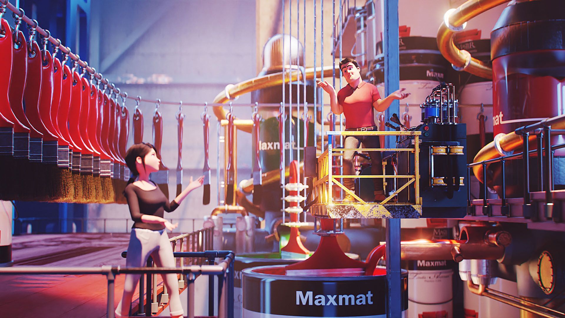 We created additional complete 3d environments such as the factory’s central area – the place we arrive right after the transition from the real world; the brush/paint lineup and the electrical devices section.