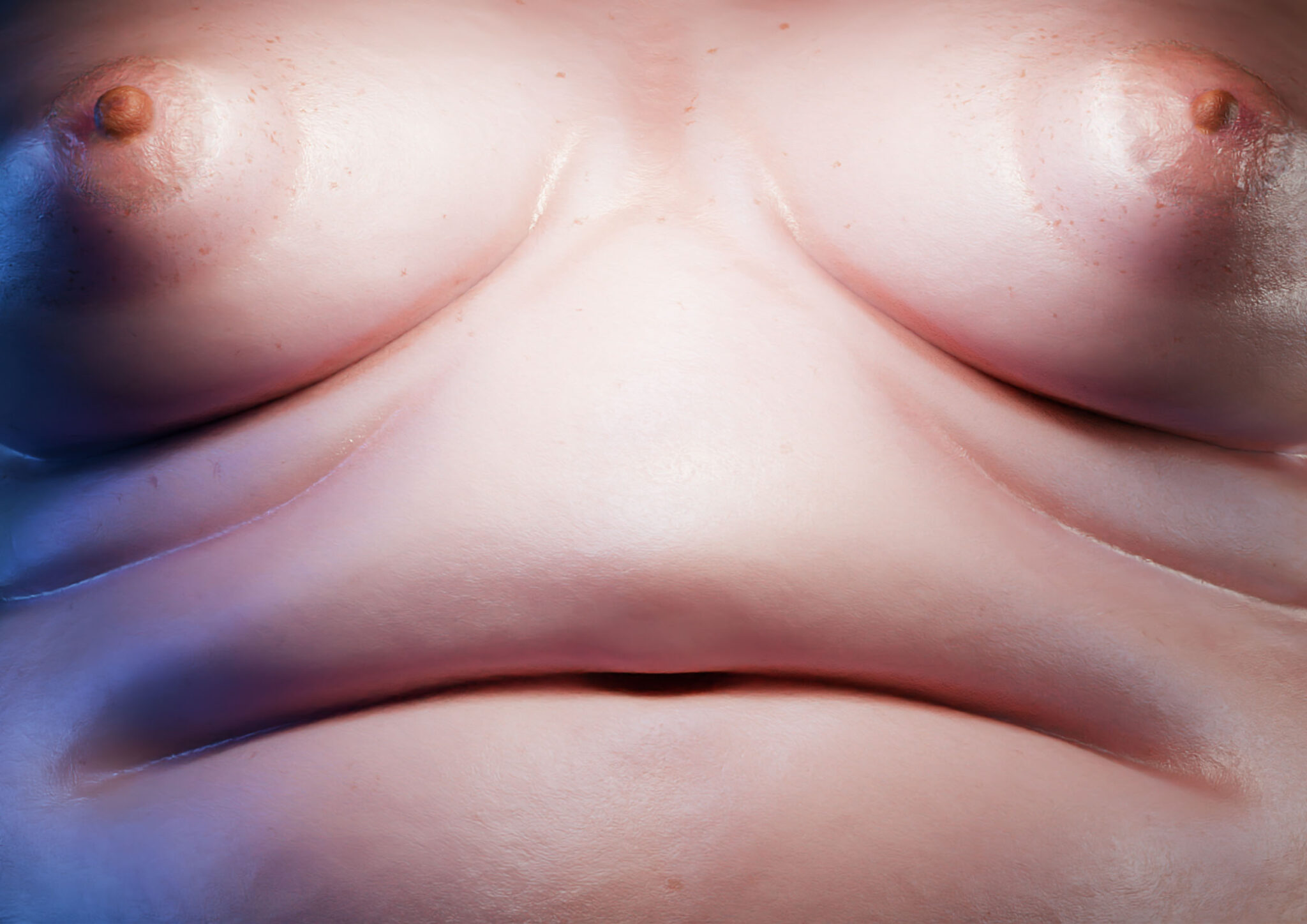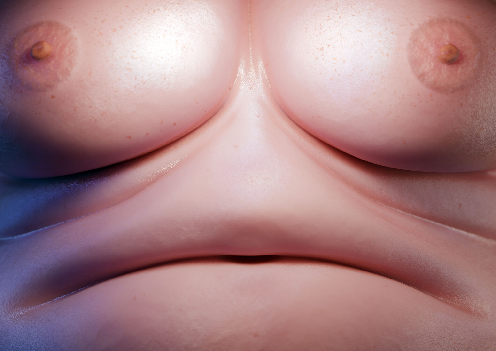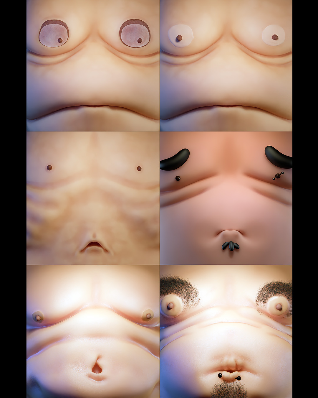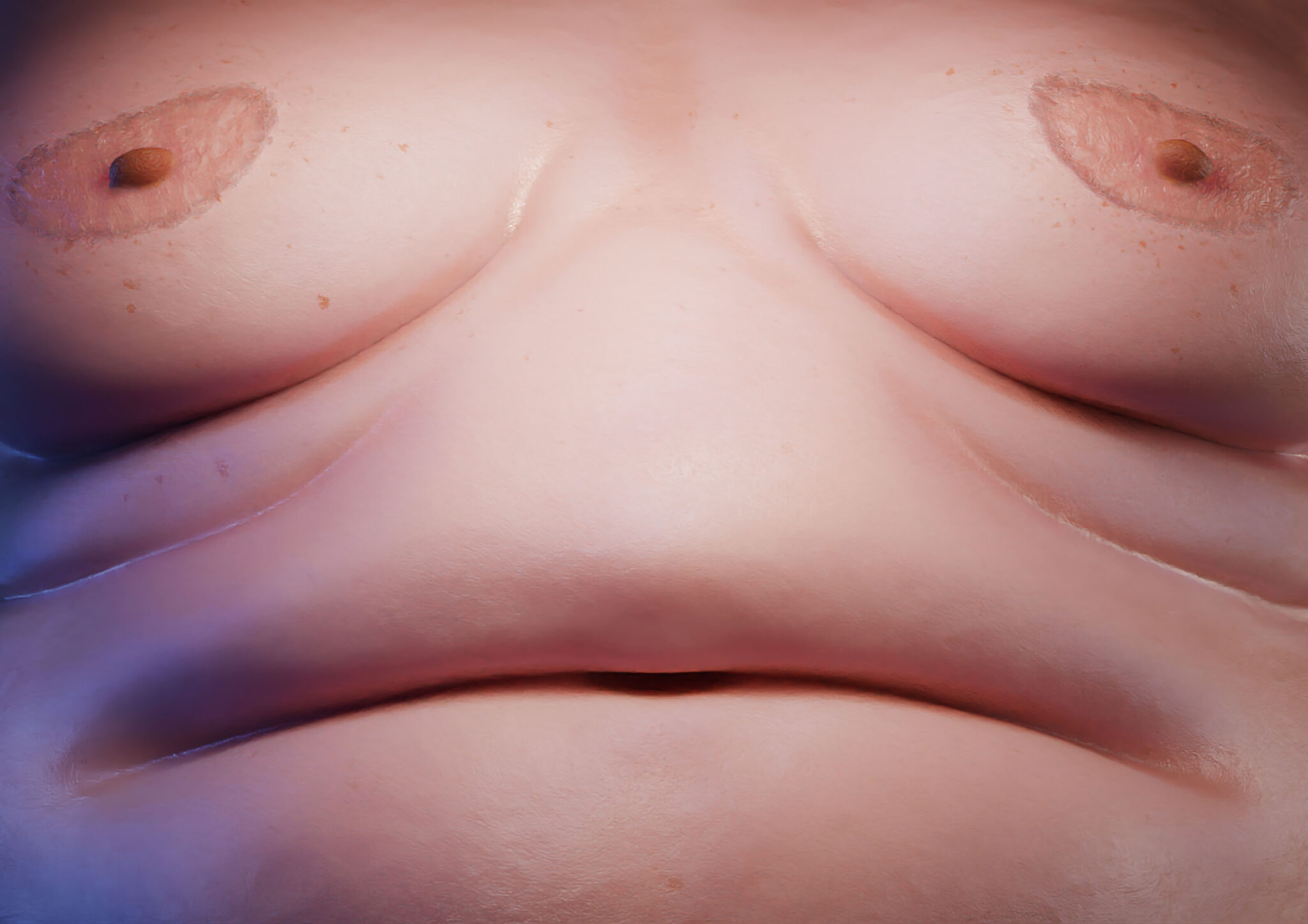 We were visually aiming for that sweet spot between a sad face and a sad belly – kind of like the optical illusions we sometimes come across. The final result is a realistic yet stylized approach to this section of the body, allowing it to be more than one at the same time.