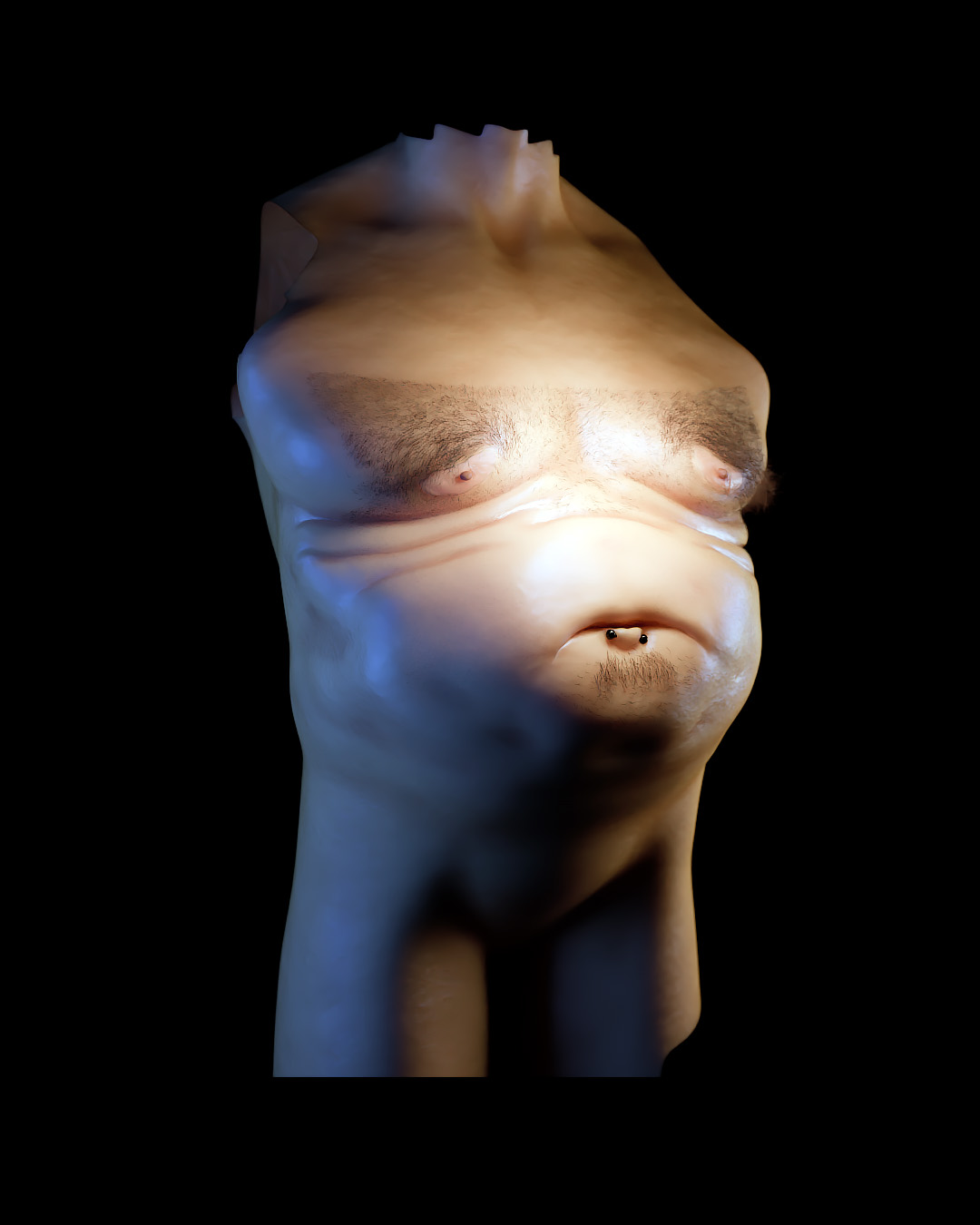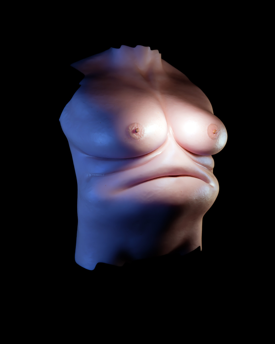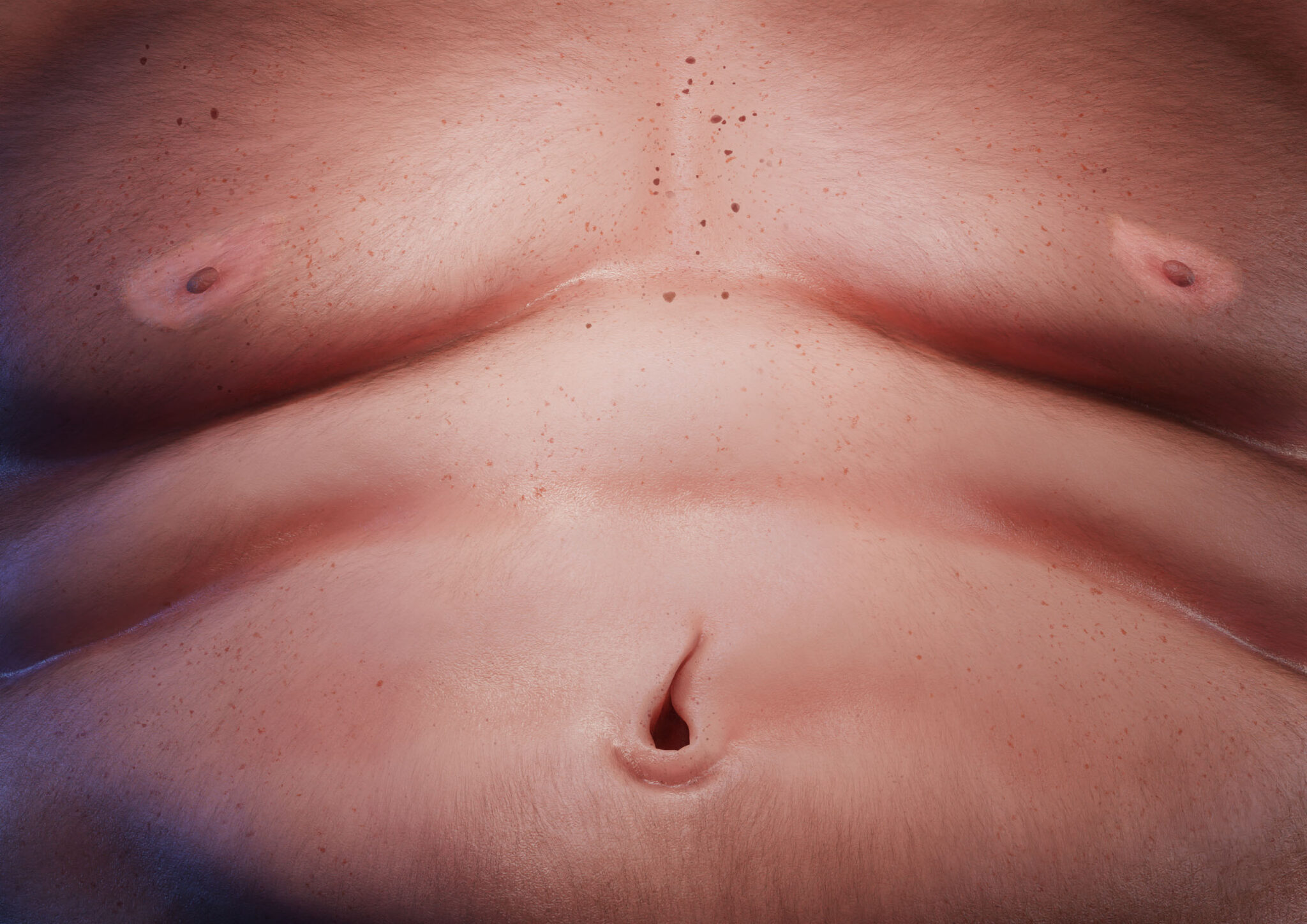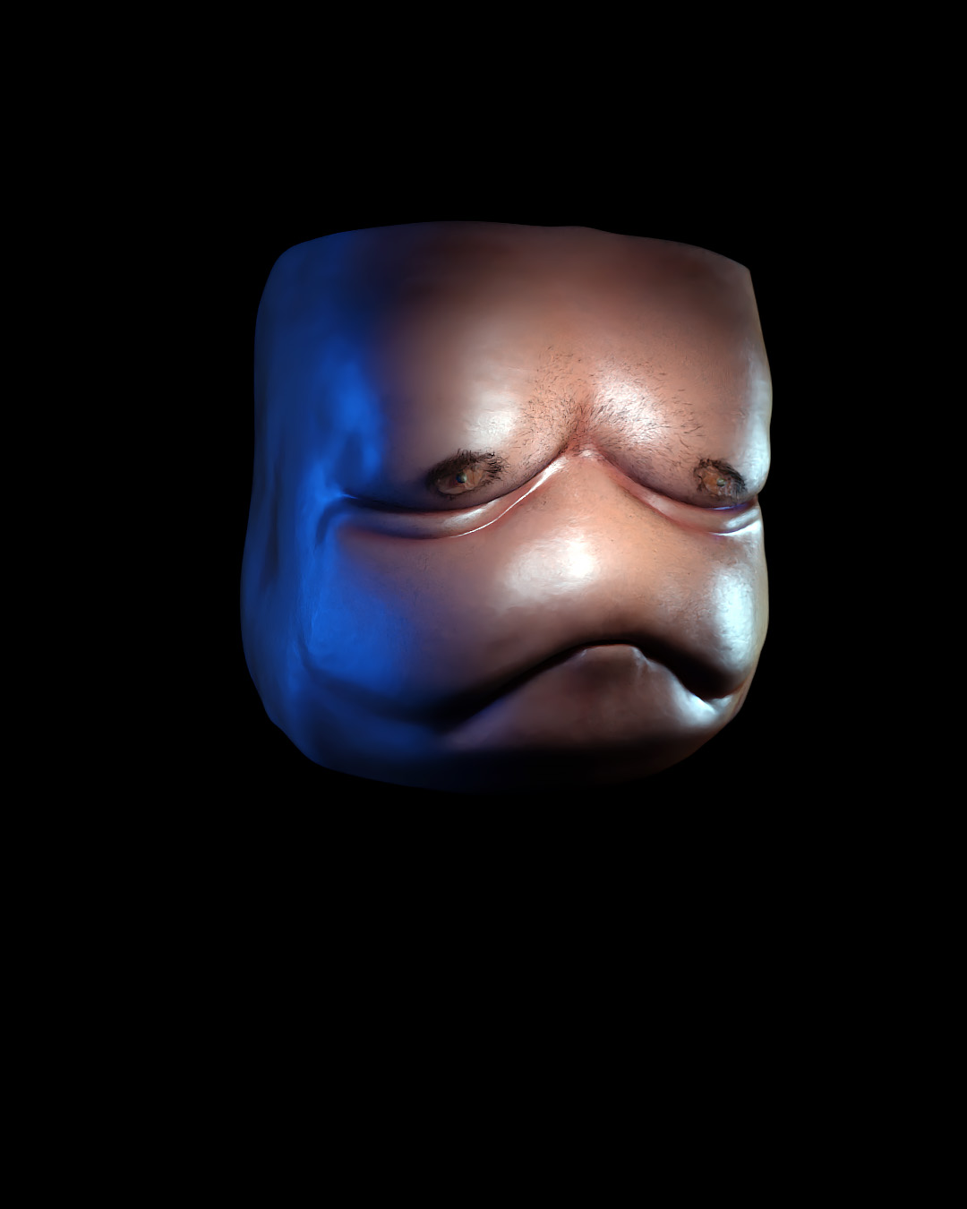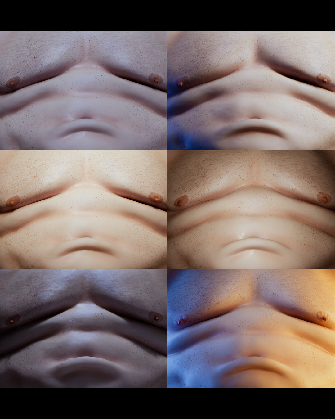 We were visually aiming for that sweet spot between a sad face and a sad belly – kind of like the optical illusions we sometimes come across. The final result is a realistic yet stylized approach to this section of the body, allowing it to be more than one at the same time.