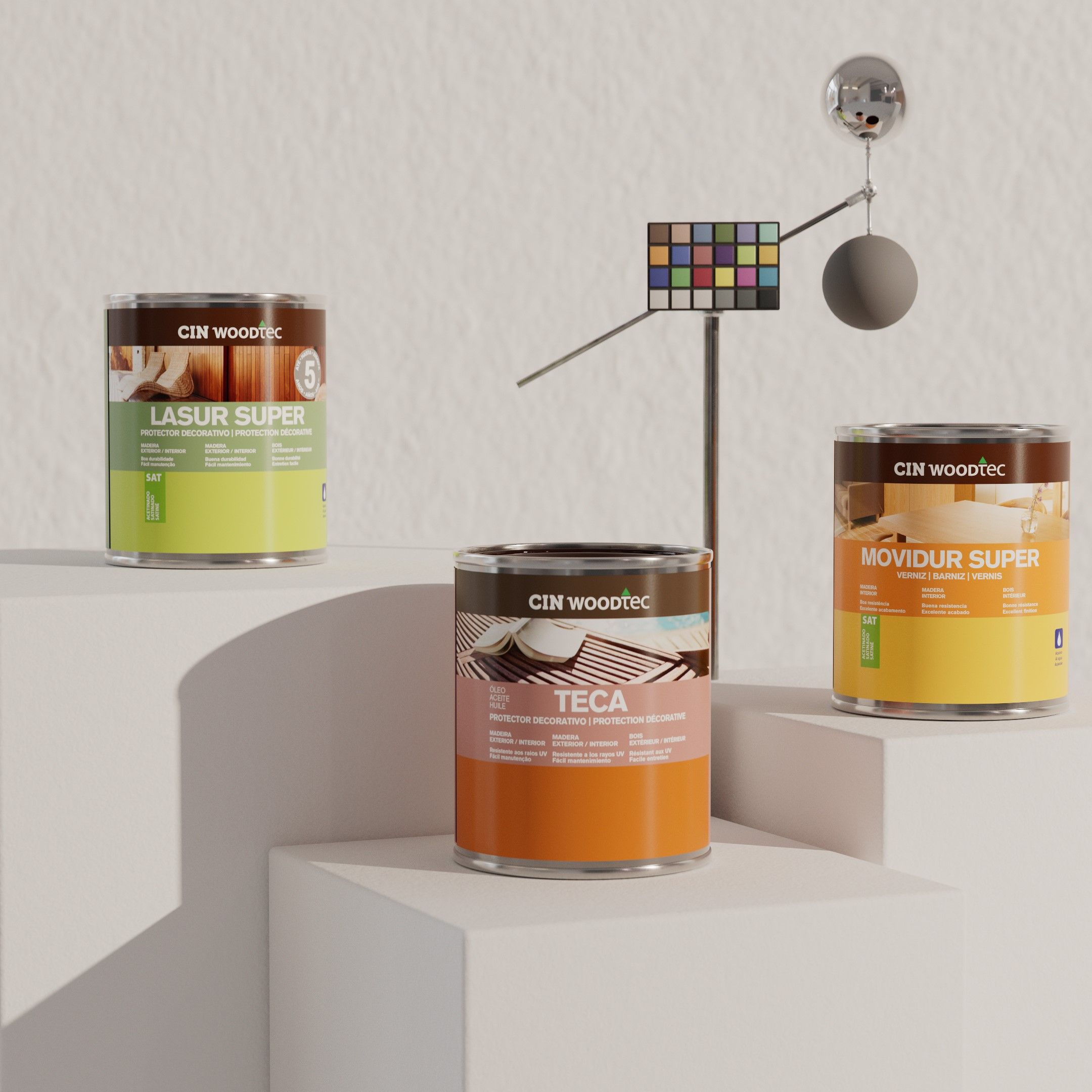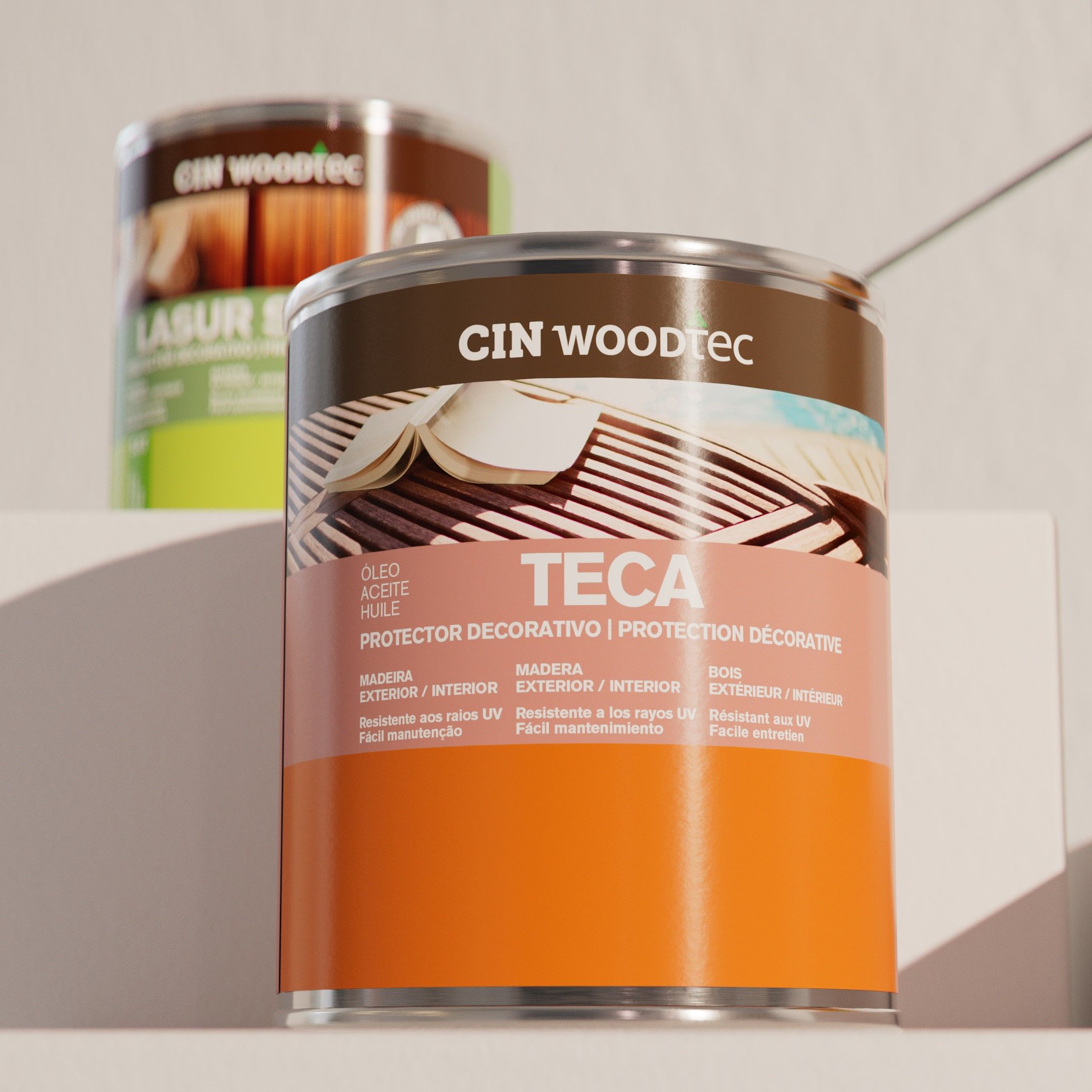 Set against an elegant and minimalist backdrop, our realistic, life-sized wooden muse demonstrates the products’ versatility across various settings, all while maintaining a seamless connection to their real-life applications. For instance, CIN’s Teak Oil, known for its enriching properties, is showcased as the perfect finish for pool decks.